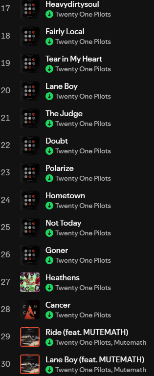 Finally we have TOPxMM. The only collab to date. Ride makes it onto the list with this feature. But just barely. Lane Boy makes reappearance. Essentially the collab is stripped vocals with the core ideas of each song better explored. Great listen and if you wanna hear remixed versions of songs: Heathens, Heavydirtysoul, Ride, Tear in My Heart and Lane Boy it’s definitely worth it. MuteMath is the attached feature and you may recognize them from the Twilight soundtrack.